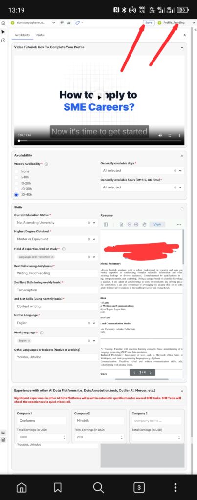 Step 11: You will be shown a form to fill. Follow the steps I’ve outlined here, as indicated in the screenshot below, but also do so in line with your existing course familiarity to avoid duplication. I am using a degree in English to apply, so my skill set includes writing and proofreading. You can always click on the save icon above.