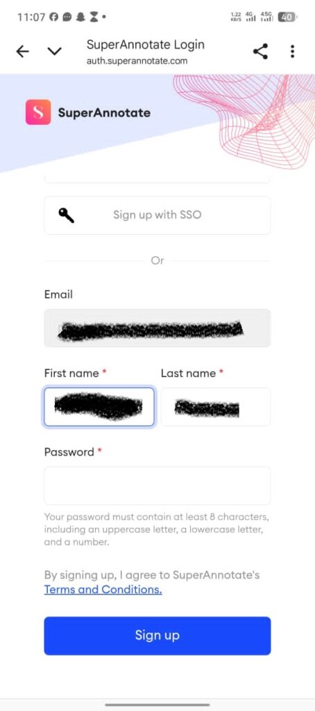 Step 5: Superannotate will send you a welcome message, and all I want you to do here is click on the link attached to the first line. When the link redirects you, you will be required to fill in your first name, last name, and a password. Once you have done this, click on “Sign up”.
