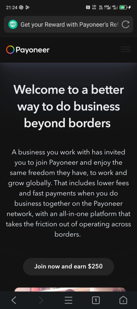Step 1: CLICK HERE to open a Payoneer account if you do not have one yet. When the page opens, click on “Join now and earn $250” and you’ll be taken to the next screen: