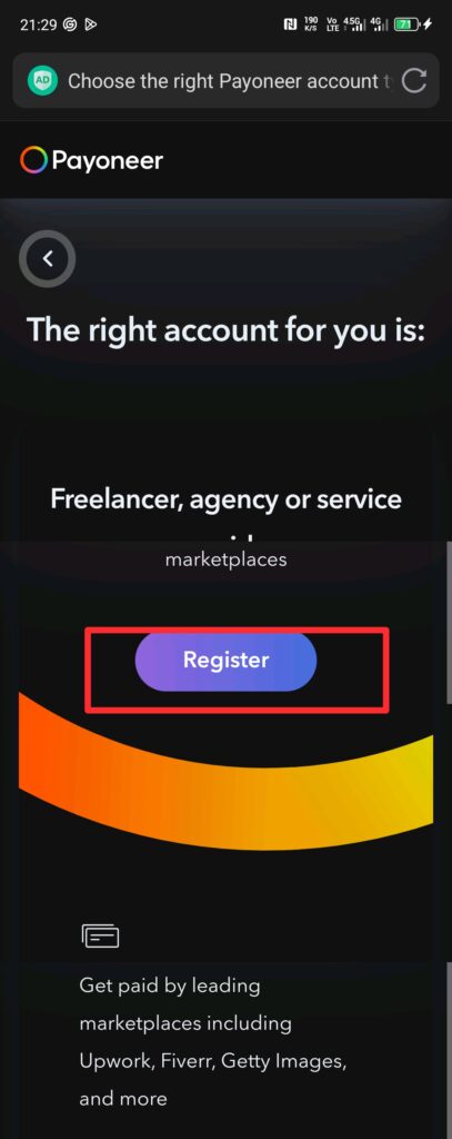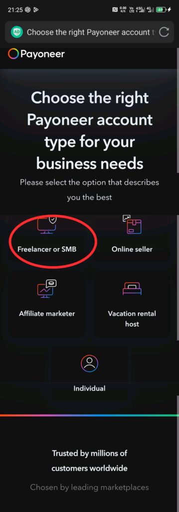 Step 2: When asked to choose the type of Payoneer account you intend to open, click on Freelancer or SMB.