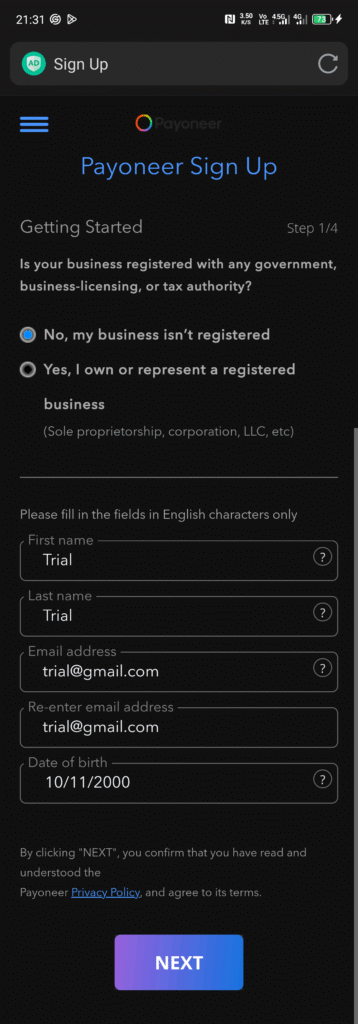 Opening a Payoneer account is fairly easy.